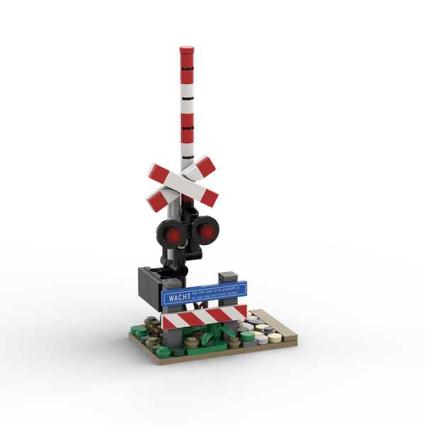 Linker uitvoering met rood-witte slagboom, knipperlichten en waarschuwingskruis. Perfect als losse set voor jouw LEGO®-wereld.