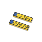 Zwei luxemburgische Nummernschilder, gedruckt auf originalen gelben 1x4-Kacheln.