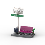 Weißer Laternenpfahl mit Bank - Grünes Schild Weißer Laternenpfahl mit Bank - Grünes Schild
