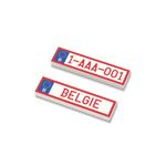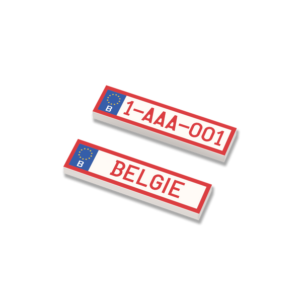 License plate BE 1x4 with EU box, red letters and piping printed on a white tile.